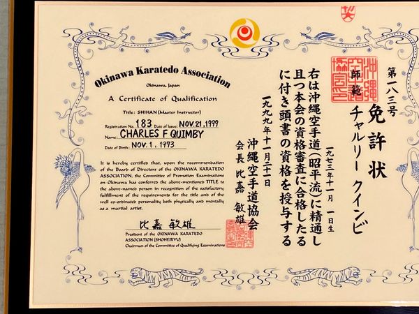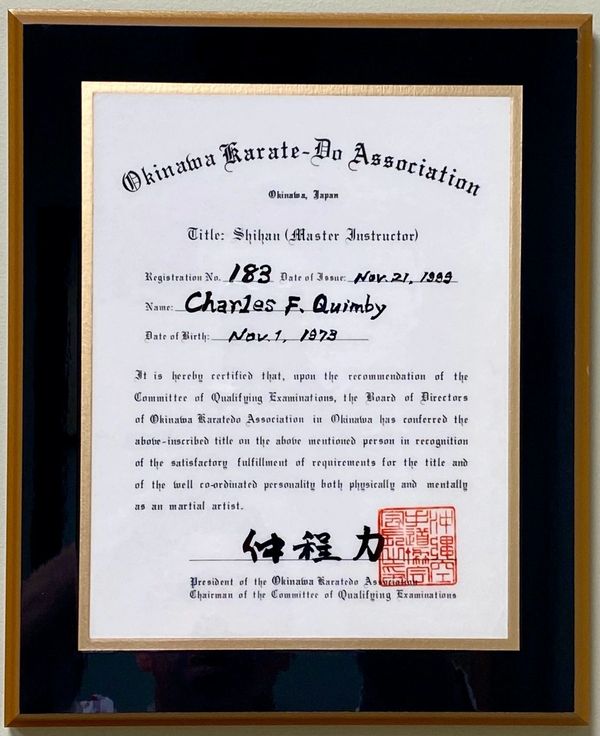 Chip Quimby is an official representative of the Okinawa Karate-Do Association (沖縄空手道協会) based in Okinawa, Japan. His dojo, the Shiseikan, located in Peabody, Massachusetts, is one of the largest chartered schools in North America to represent the association.